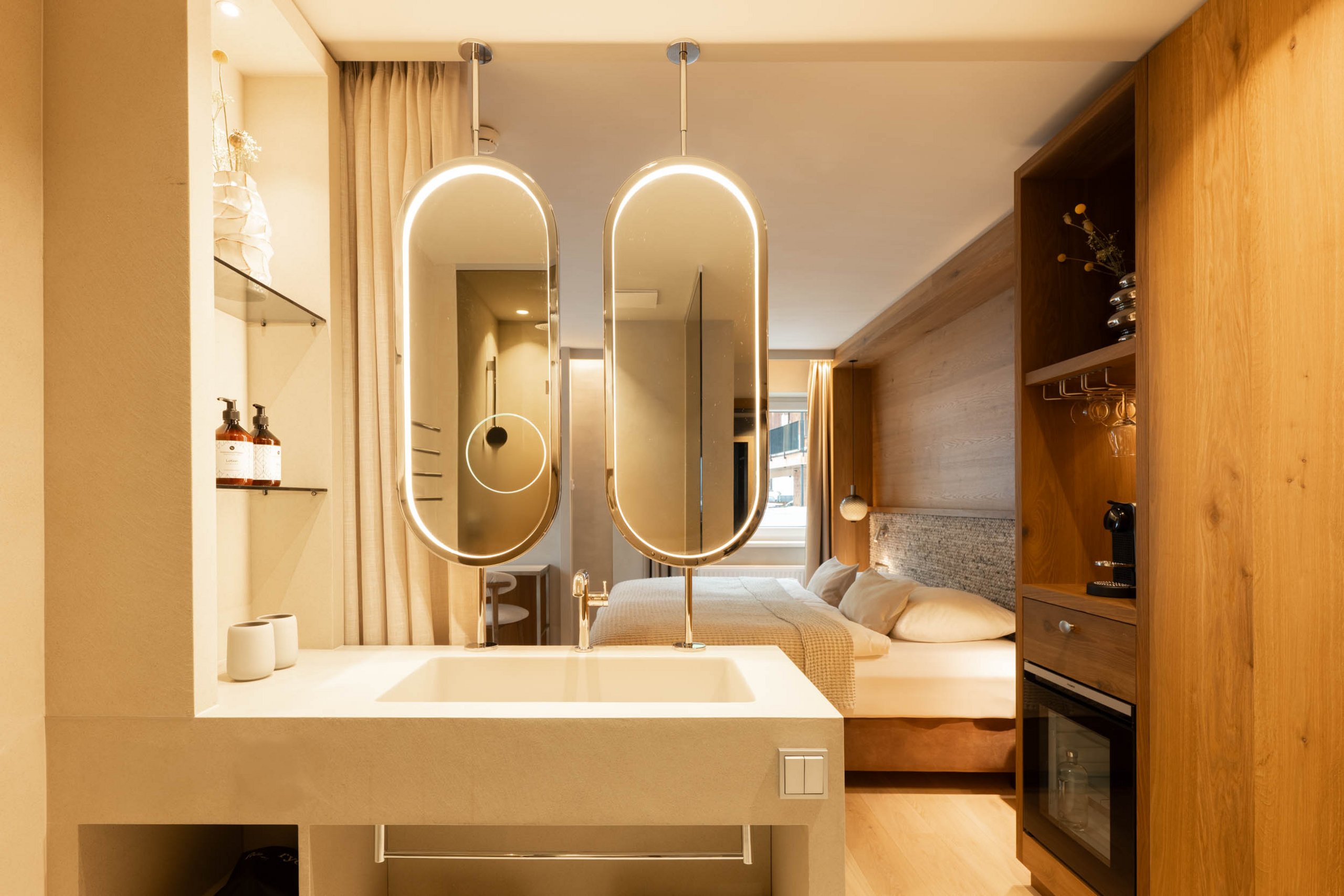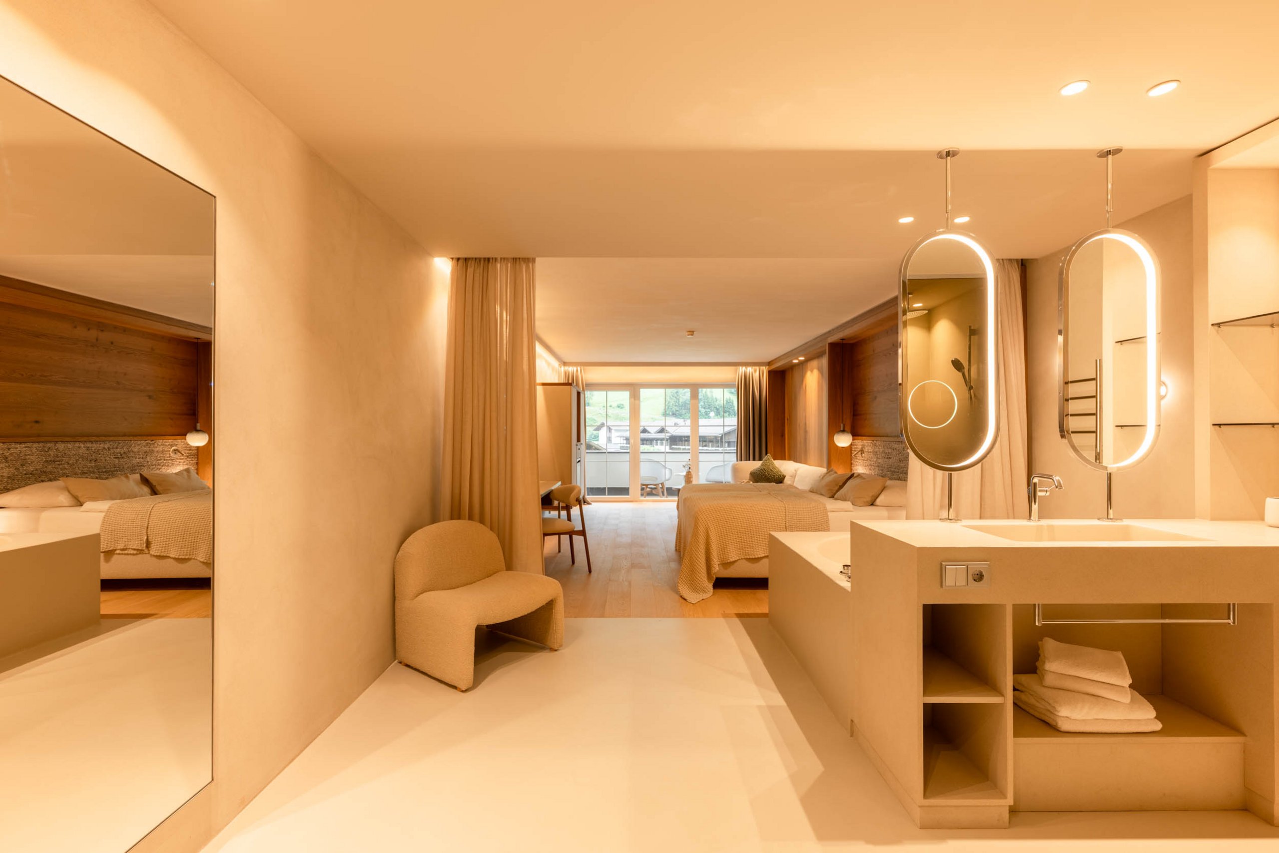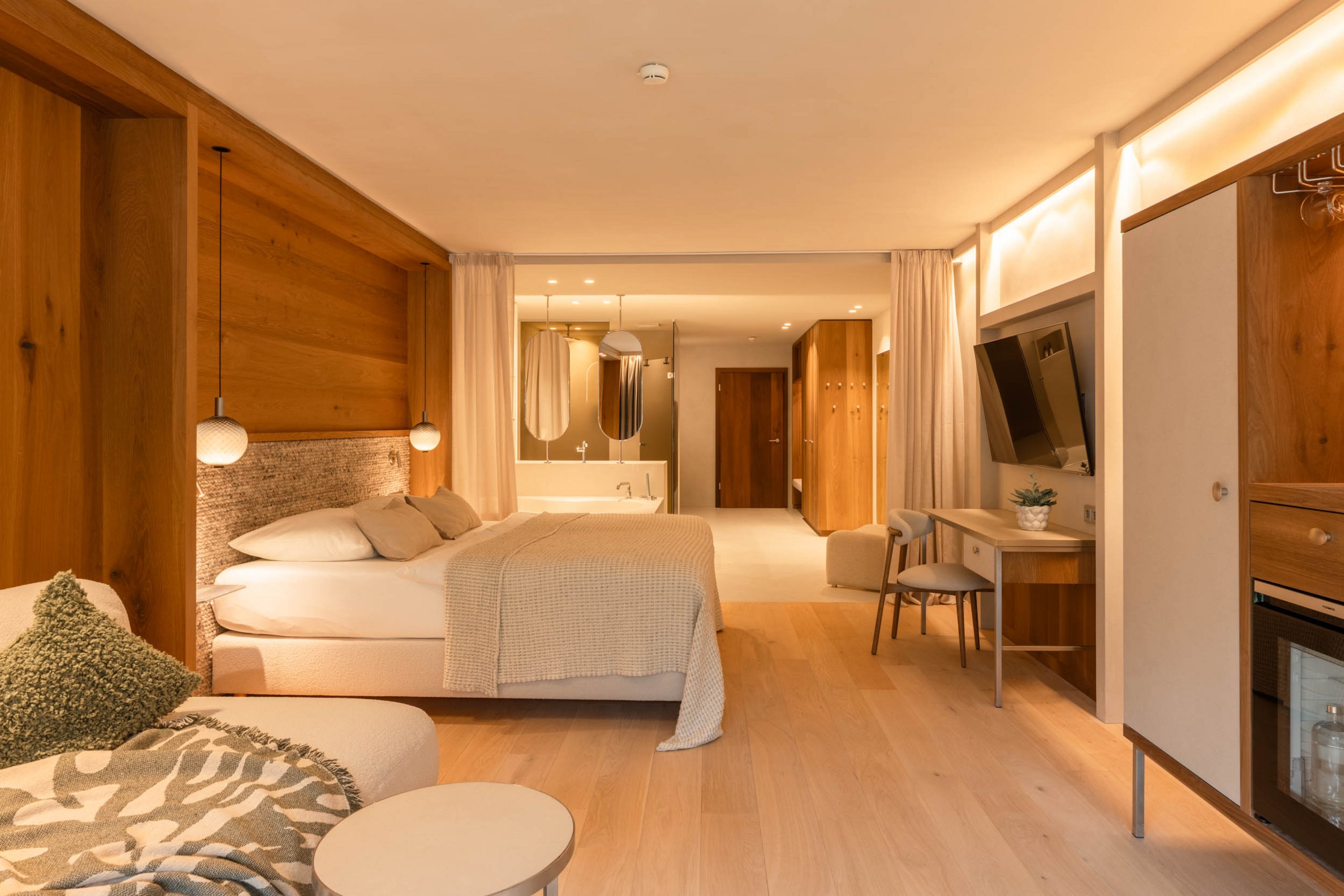 Die nagelneue Suite, sonnenseitig gelegen und mit freiem Bergblick überzeugt mit modernem Design und purer Gemütlichkeit.
